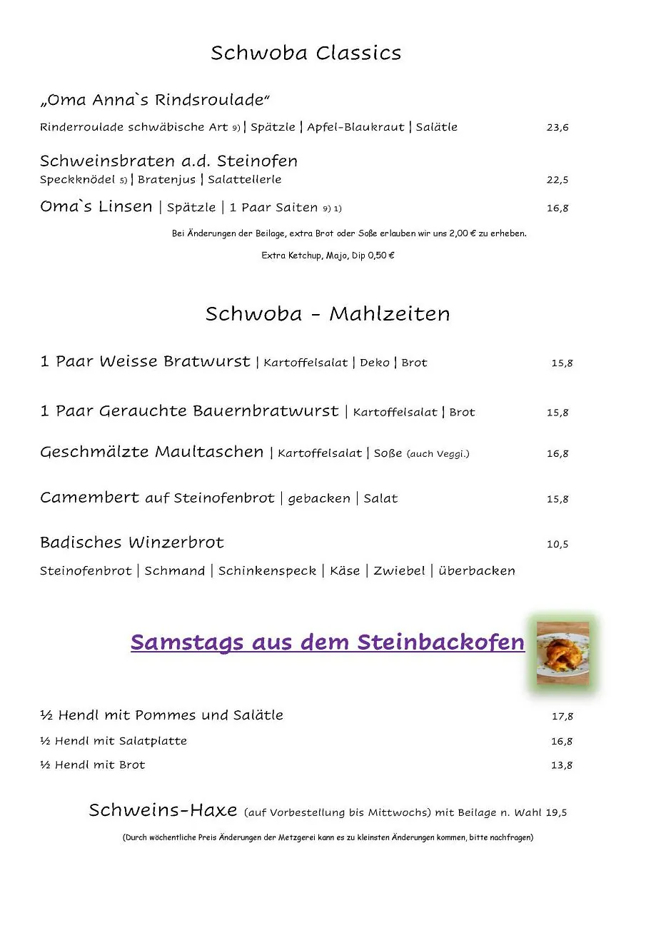 Wir begeistern unsere Gäste mit einer breit gefächerten Speisenauswahl. Für den kleinen Hunger empfehlen wir unser Schwäbisches Vesperbrett oder an Kääs. Wenn Sie Lust auf eine Hauptmahlzeit haben, können Sie aus vielen Fleischgerichten und vegetarischen Spezialitäten wählen, zum Beispiel den beliebten Schwoba-Salot oder eine unserer Bowls aus dem Wok. Besonders ans Herz legen möchten wir Ihnen unsere „Schwobasochen“: die geschmälzten Maultaschen mit Kartoffelsalat und Sauce, die weiße Hochzigbratwurst, Oma’s Linsen mit Spätzle und den Camembert auf Steinofenbrot mit Salat. Samstags erweitern wir unser Angebot um Schweinshaxe und Hendl aus dem Steinbackofen. Alle Speisen werden selbstverständlich frisch von unserem Chefkoch zubereitet.